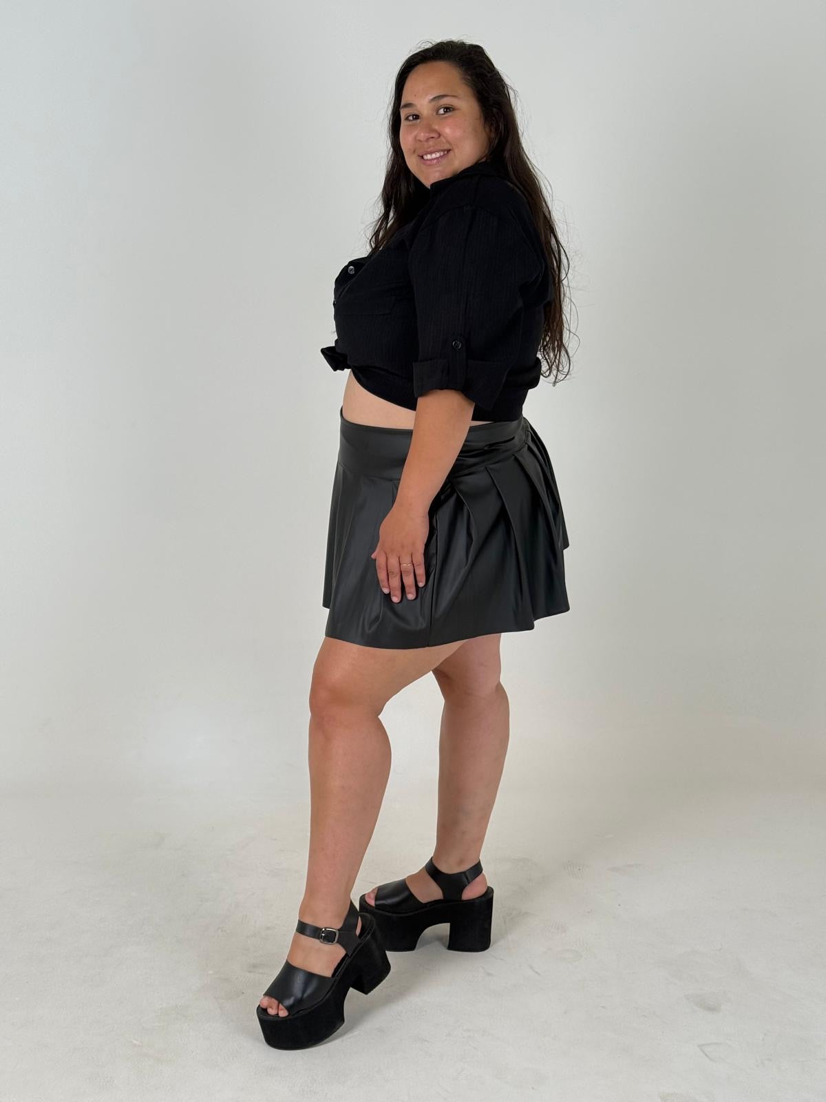 Su diseño tableado le da movimiento, frescura y un toque de rebeldía que convierte cualquier outfit en un look explosivo. Es corta, canchera y con una presencia que no pasa desapercibida.